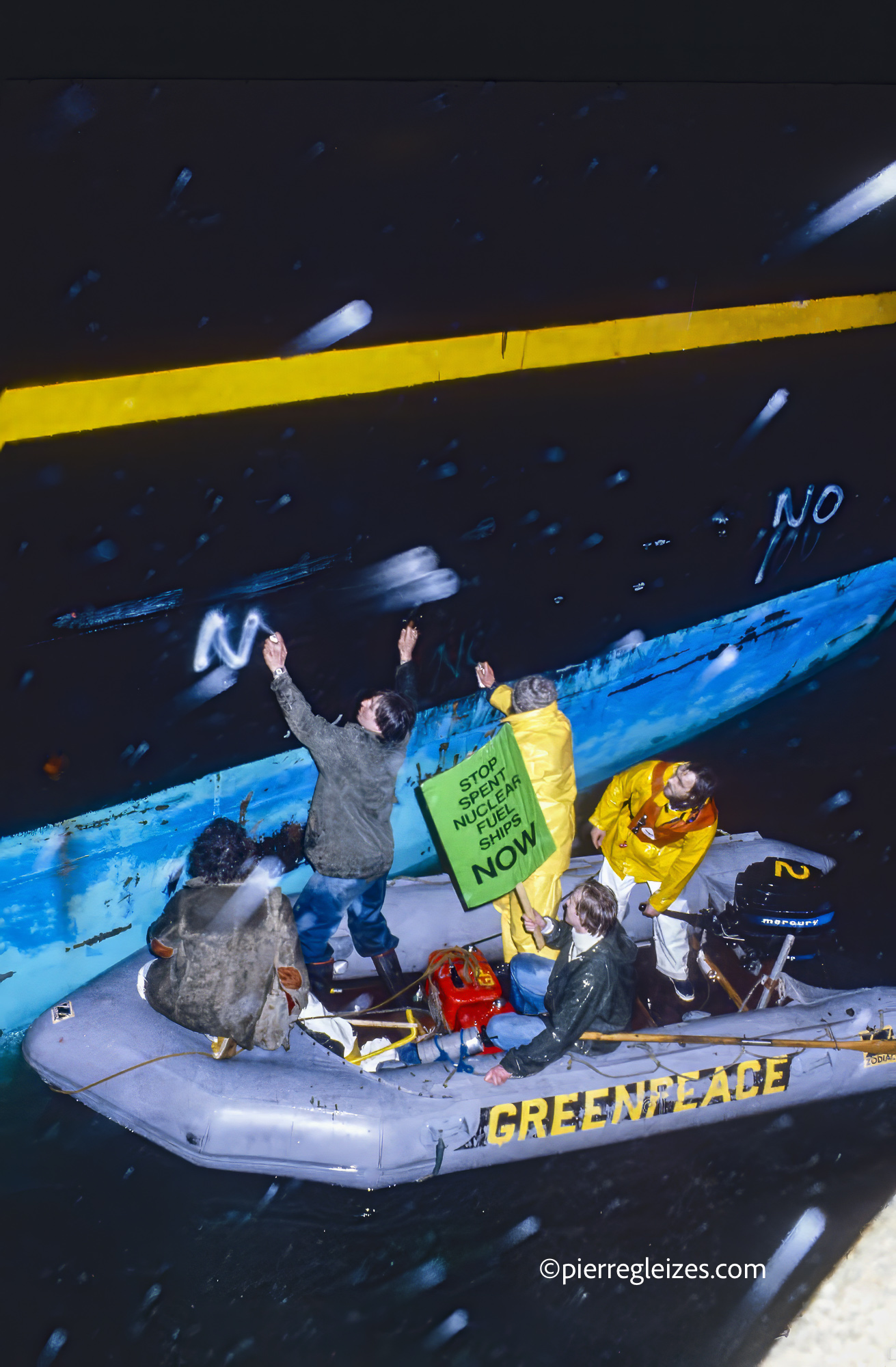 Ce récit photographique commence avec mon tout premier reportage pour Greenpeace, réalisé lors d’une attente de trois semaines au large des côtes britanniques afin d’accueillir, avec tambours et trompettes, un cargo chargé de déchets nucléaires japonais.